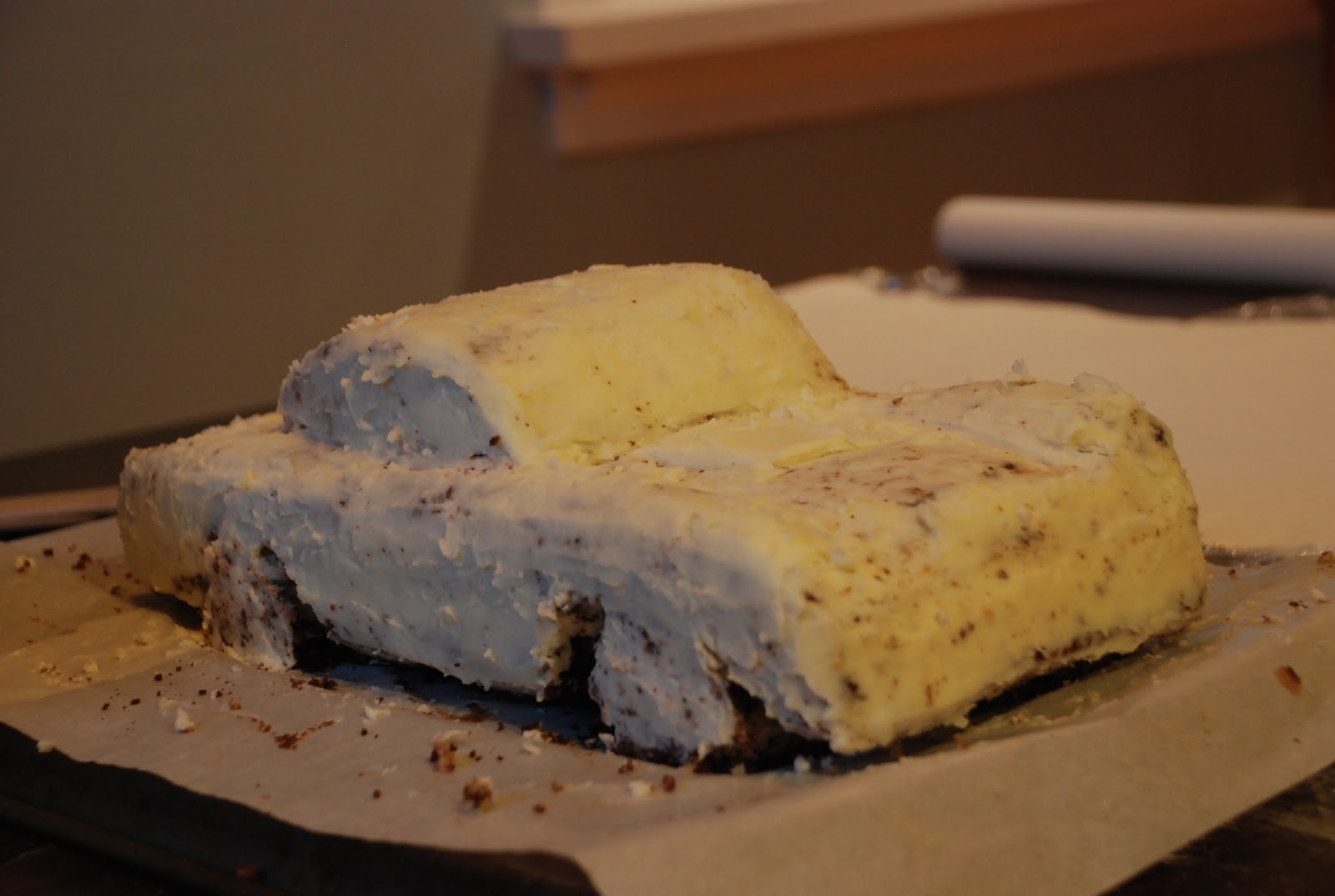 Then it was time to cover it in buttercream. I made sure to use the frosting to help emphasize my carving and build up on areas where I was a bit overzealous with the knife. Yes, big mess. What else is new?