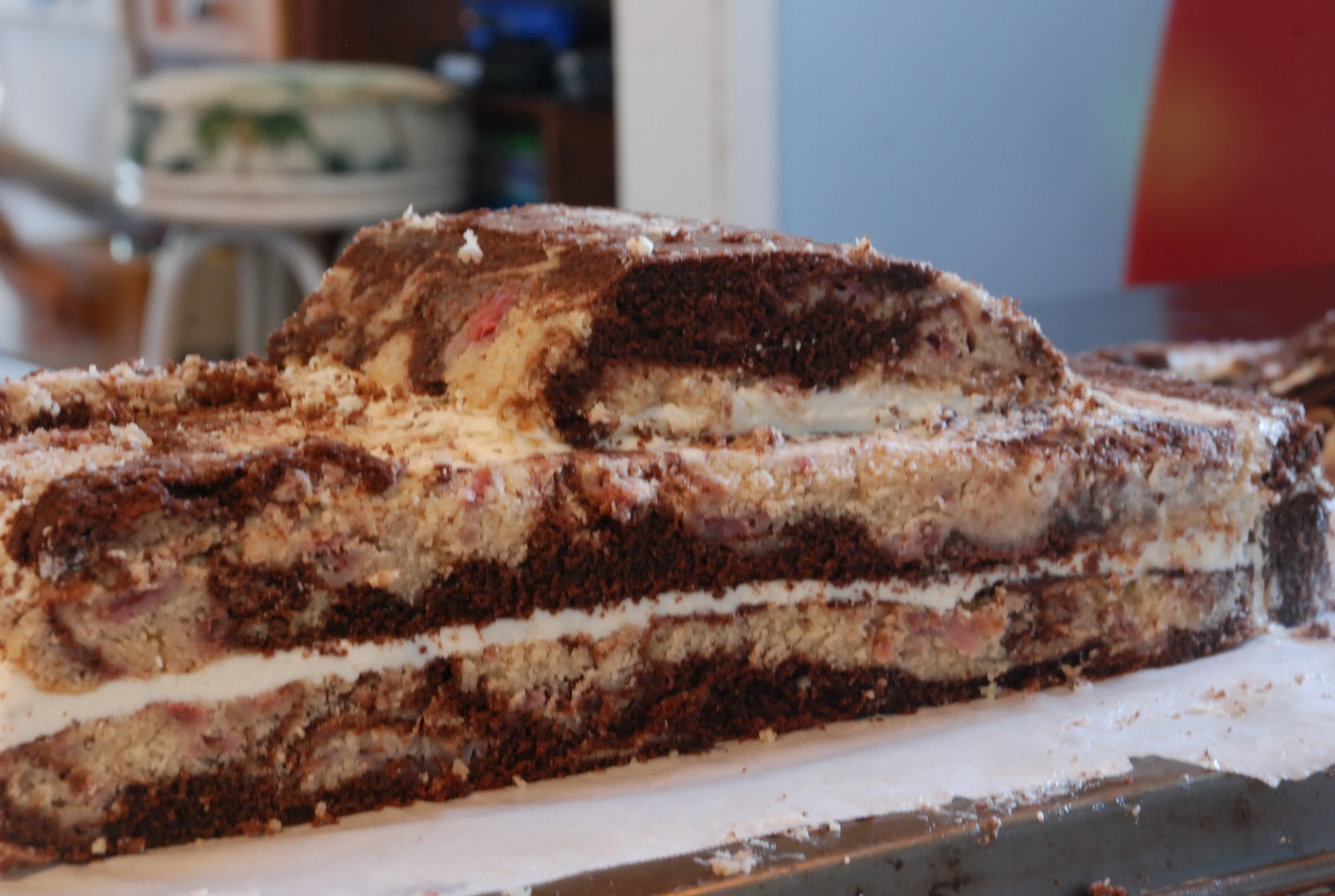 The insides are chocolate/strawberry marble with swiss meringue buttercream inside. I baked two 9×13 and one 9×9 cake, then plopped them on top of each other.