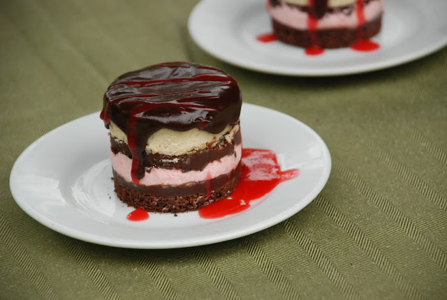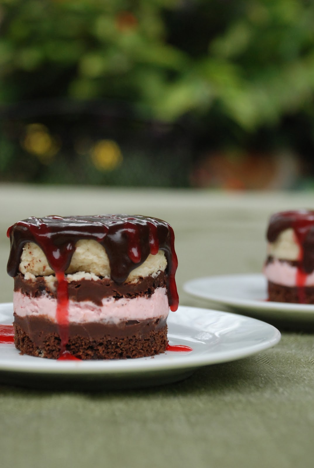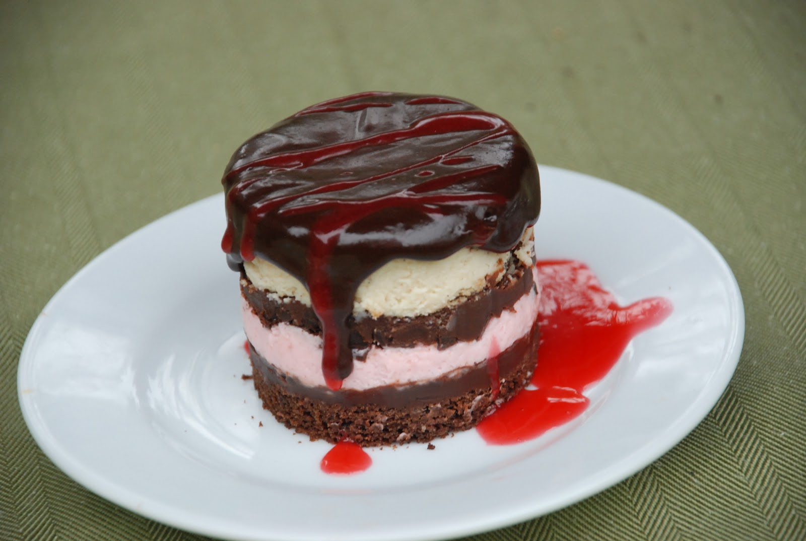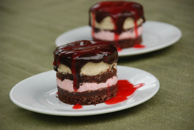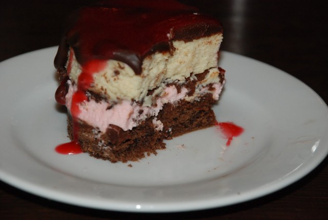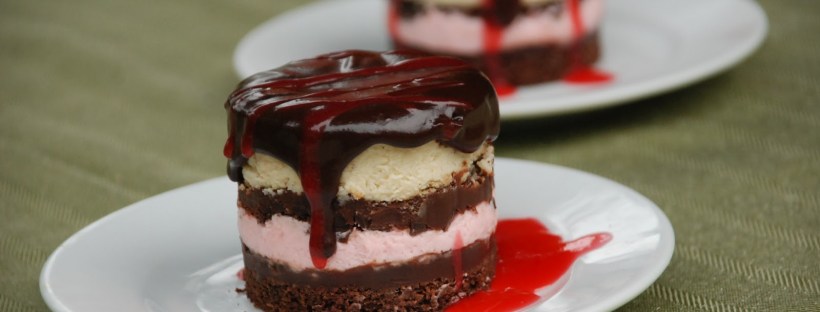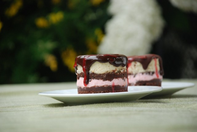 The pink layer is a tart raspberry mousse, made with raspberry and whipped cream. That was my favorite and I used the leftovers to fill a cake. So tasty and it helped lighten up this super-rich dessert quite a bit.