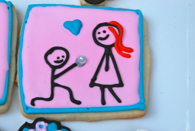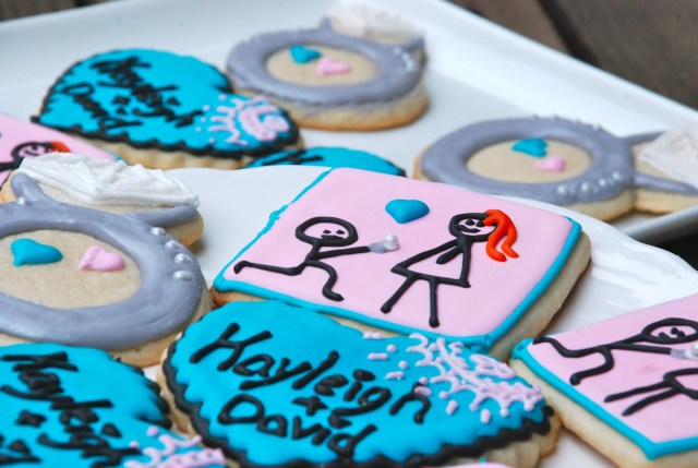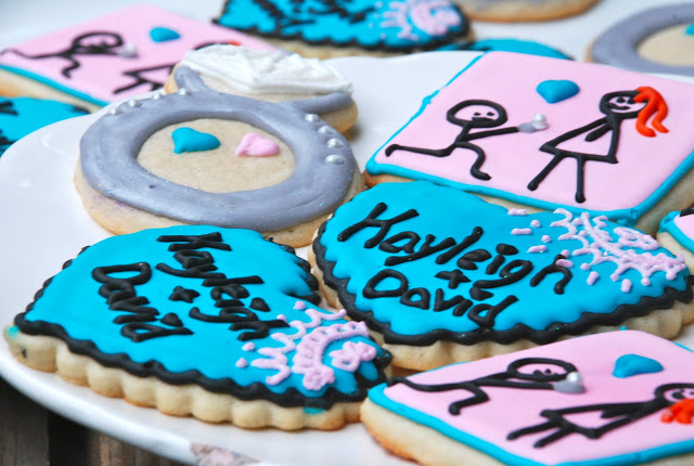 The bride-to-be has the most gorgeous red hair, so of course the cookies with the stick figure proposal had to include that personalization.