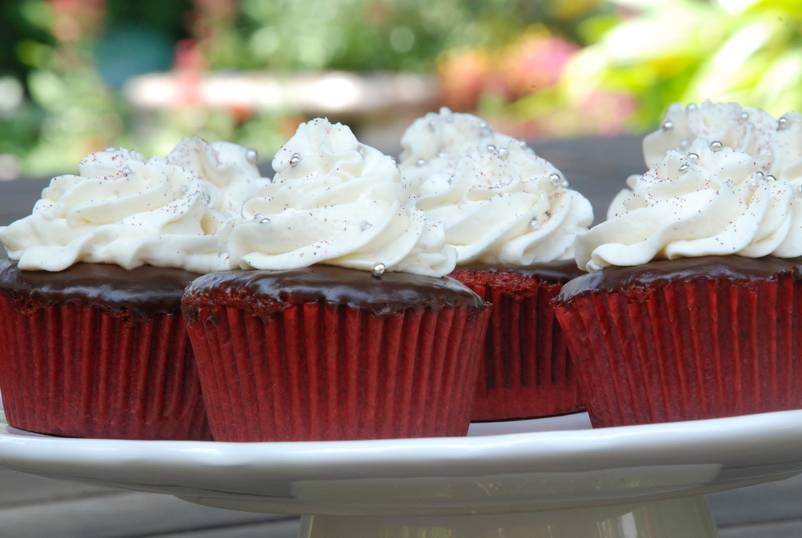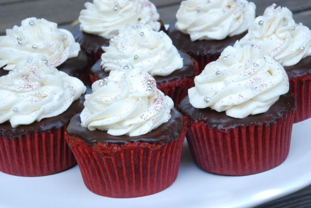 Red velvet cupcakes with oreos at the bottom. Dipped in chocolate ganache. Cream cheese frosting on top.