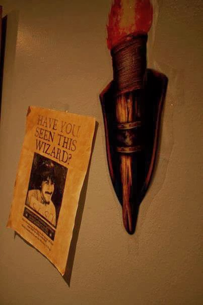 The bathroom was super creepy with a homemade moaning myrtle CD and a giant picture of a troll. Each framed photograph in the house was replaced with pictures of knights and other mythical people and streamers in house colors decorated the ceiling. In the corner was a giant spider.