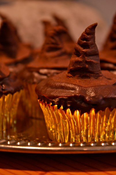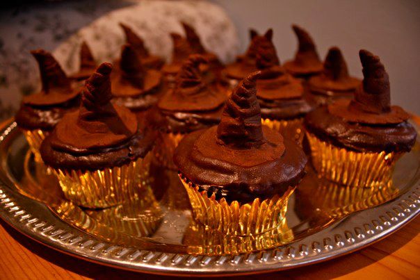 Sorting hat cupcakes. We used these to “sort” our guests into houses when they arrived. Each cupcake had cake/pastry cream filling in colors representing a house. The guests had to pick a cupcake, take a big bite, and reveal which house they were in!