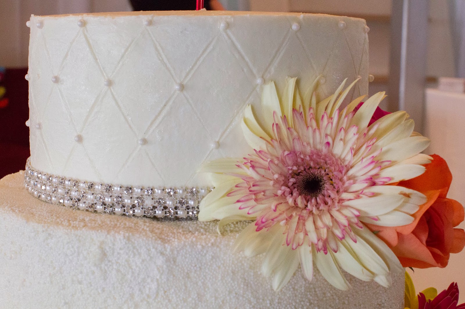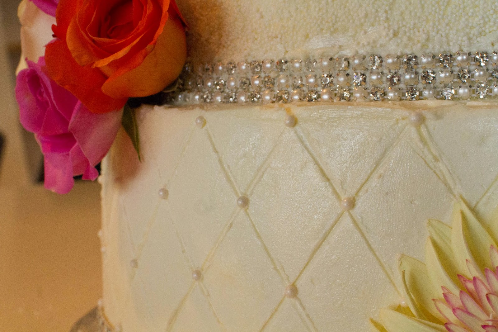 The trim is non-edible, but oh so pretty! I love the rhinestone and pearl combination because it gave it a bit of sparkle without being too over the top and the pearls on the ribbon matched the sugar pearl detailing.