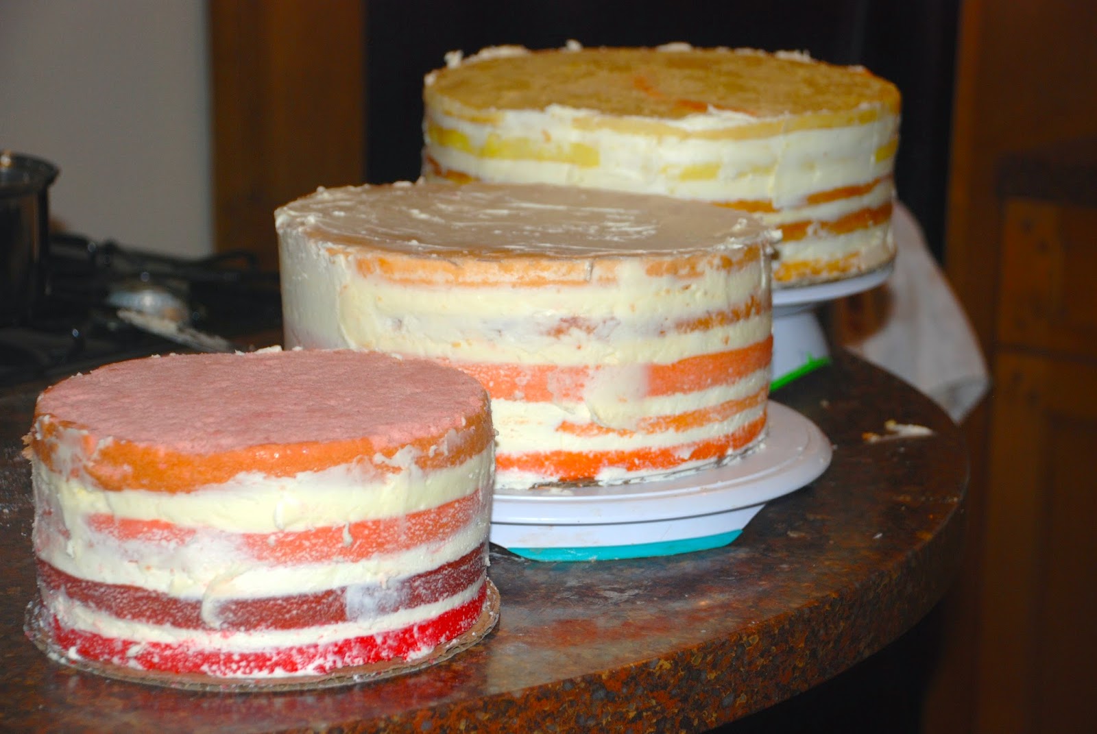 The layers all lined up next to each other. Yellow base tier was a 12″ round–it barely fit into my little oven.