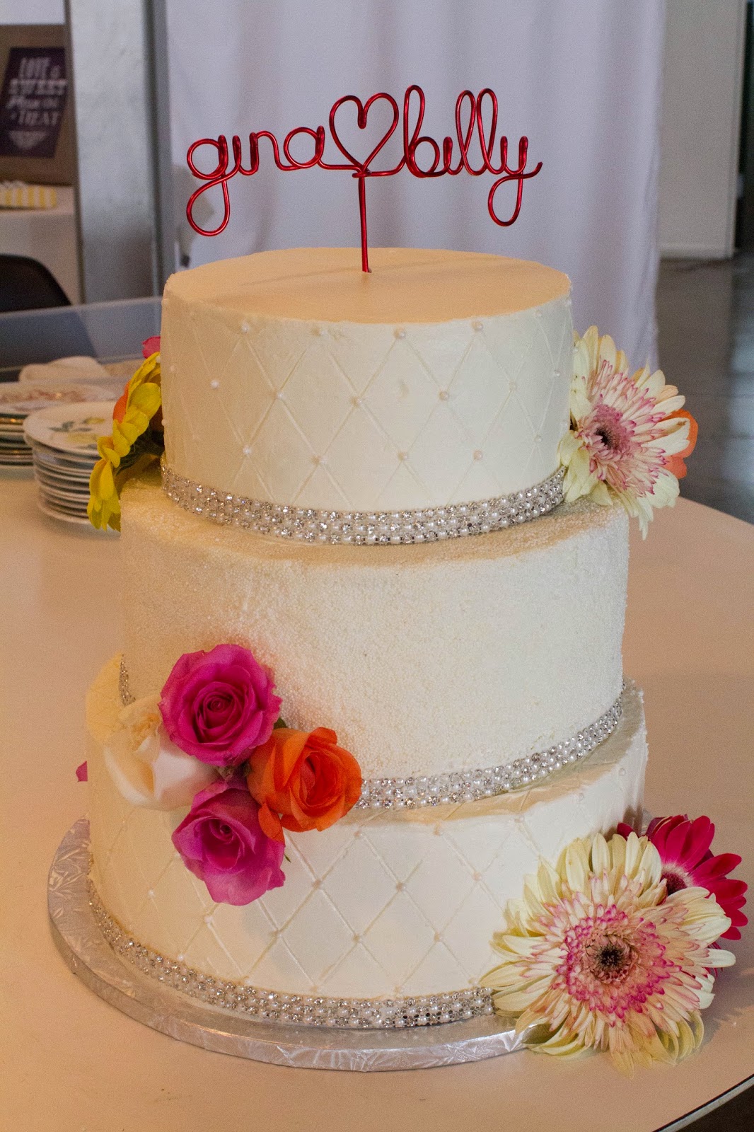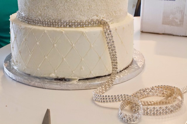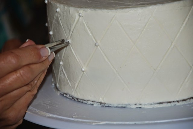 Oops. Skipped a few steps. I smoothed out the frosting and pressed the diamond pattern into the cake using an impression mat and defined the lines better with a nice, big knife. Then, using tweezers, I added sugar pearl at each intersection to give the cake that beautiful quilted effect.