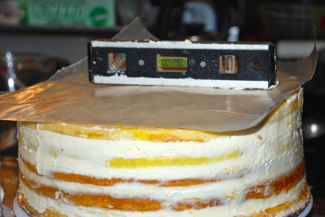It’s important to get the layers level, especially the bottom tier. Because it supports the weight of the rest of the cakes, if it’s uneven even a little bit on the bottom tier, the entire cake will start to learn over. So, I picked up a new level at Home Depot, sanitized it, and got to work!