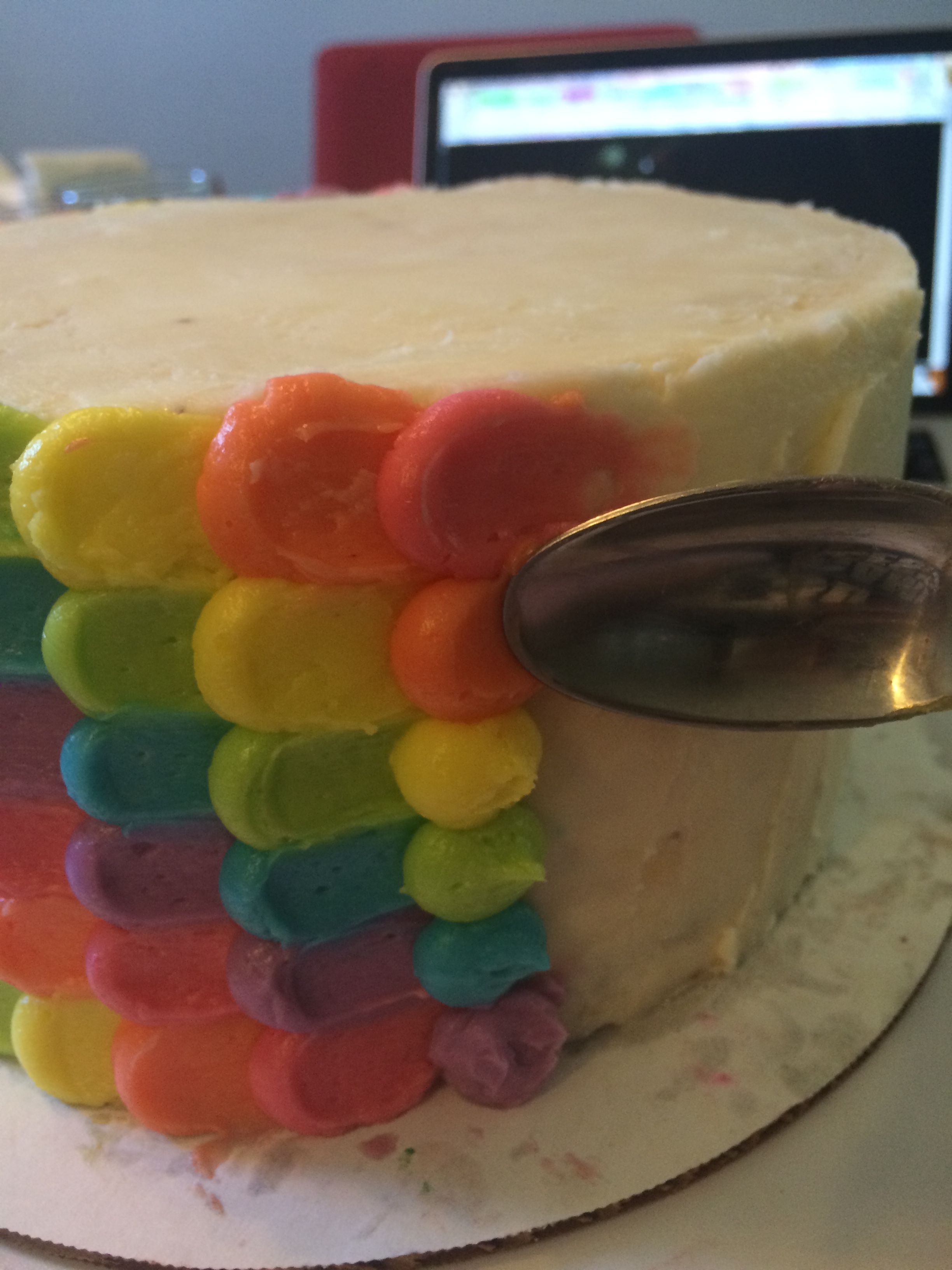 For the pretty petal effect, take the back of a spoon and gently smoosh the blob, pulling the spoon and the frosting outwards. I kept 6 spoons next to my frosting, one for each color dot so the frosting colors wouldn’t get muddy.