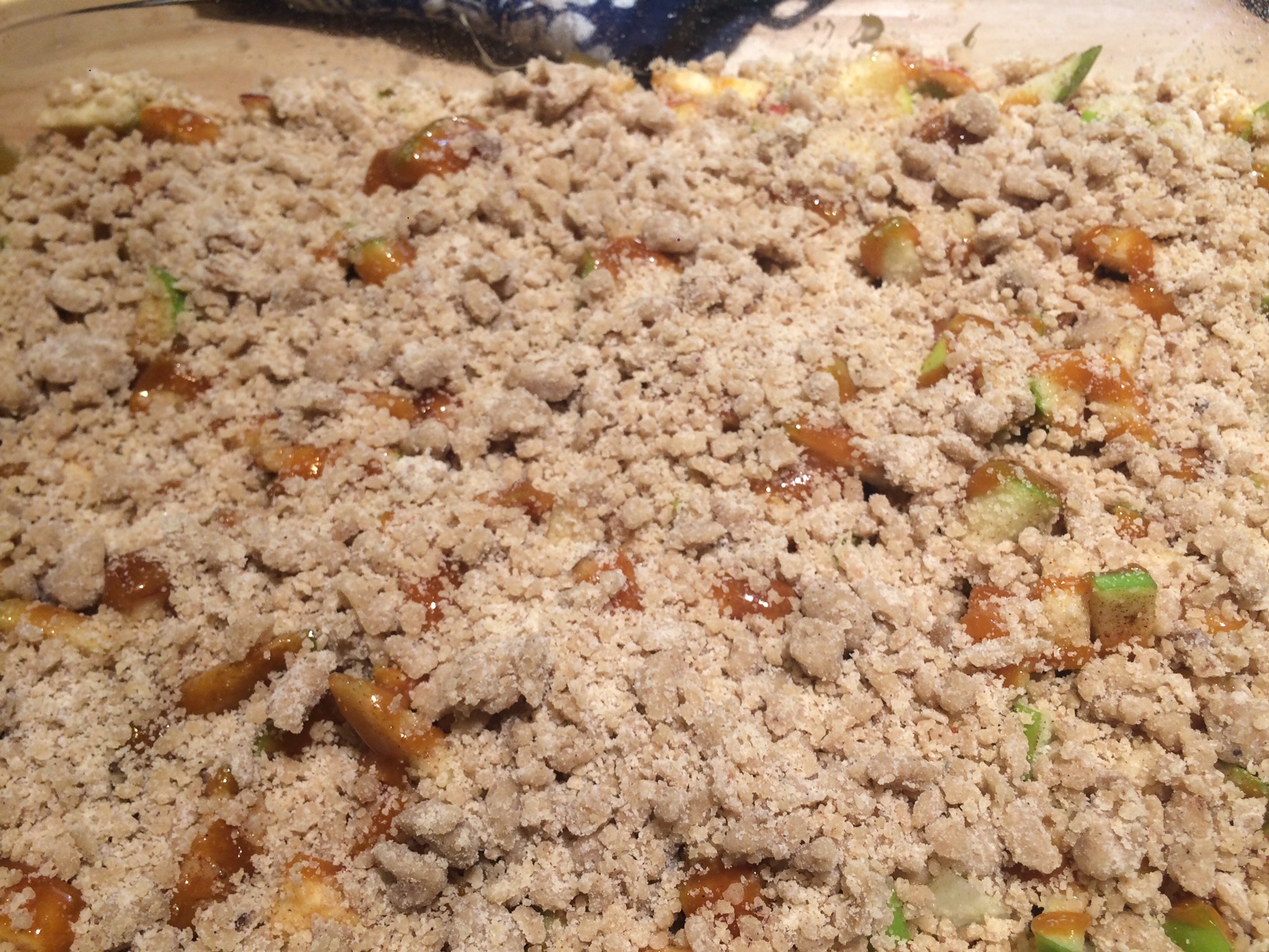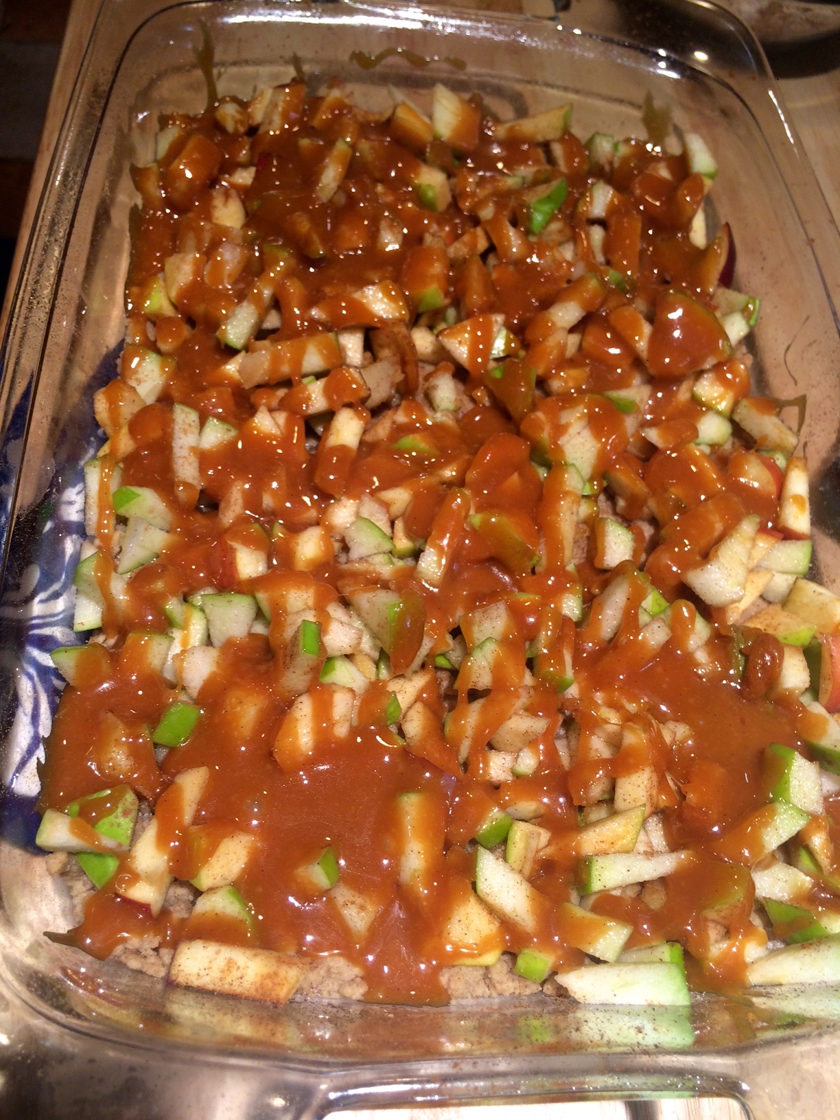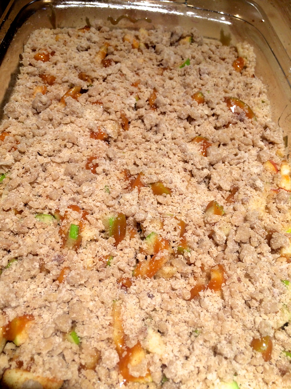 - Scatted chopped apples, granulated sugar, salt, cinnamon, and nutmeg over the crust. Pour caramel evenly over apple later and sprinkle your crumble topping over everything.