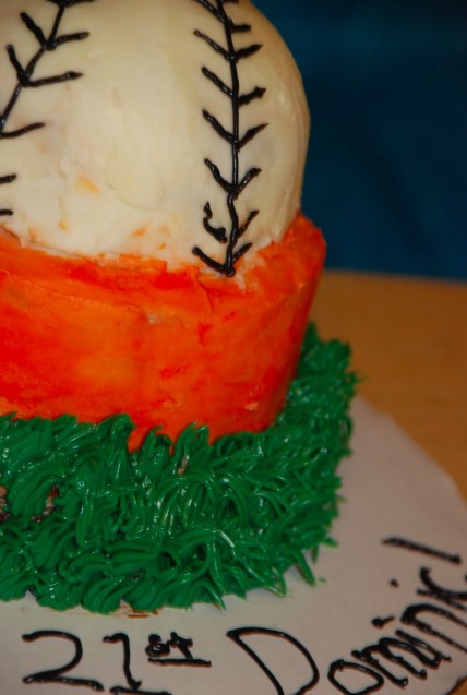 The birthday boy’s girlfriend wanted a Giant’s colored baseball themed cake and left the designing up to me (my favorite kind of order!). Well, baseballs aren’t orange, so I did the best I could to keep tried to the theme and stick to the basics of the game.