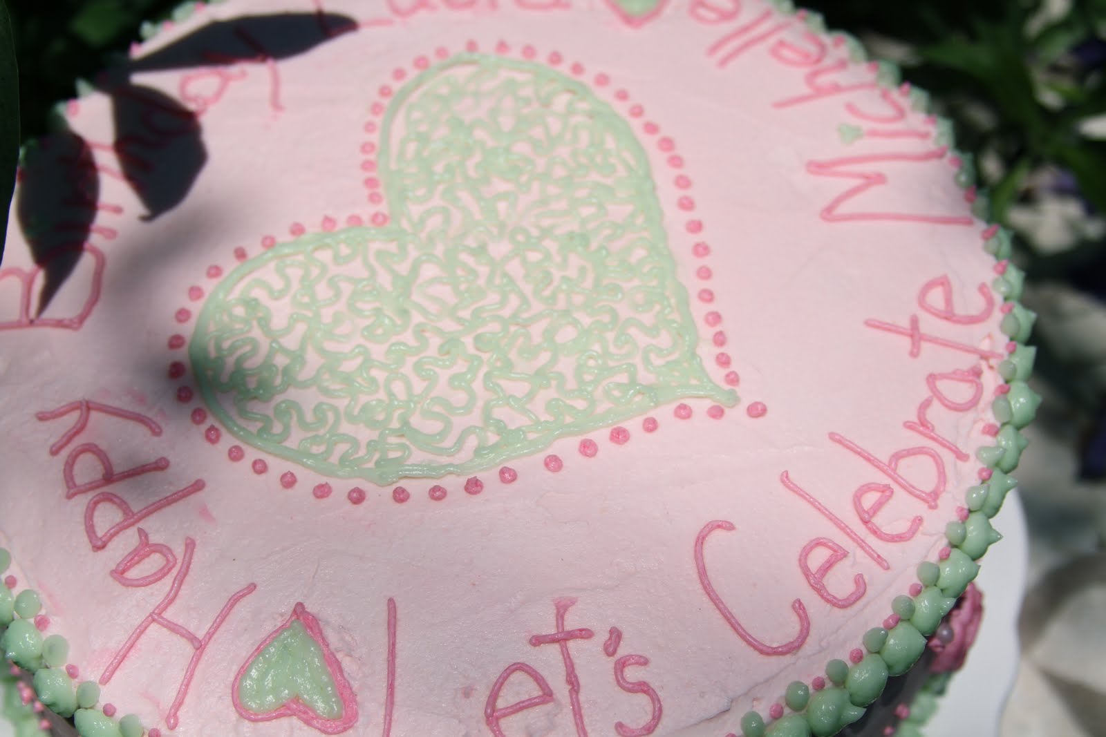 My mom and I wore out matching bright pink “I Like to Bake” shirts and kept replenishing the treats as the guests enjoyed them. You can’t see the little notecards very well, but we made little signs telling guests about each treat.