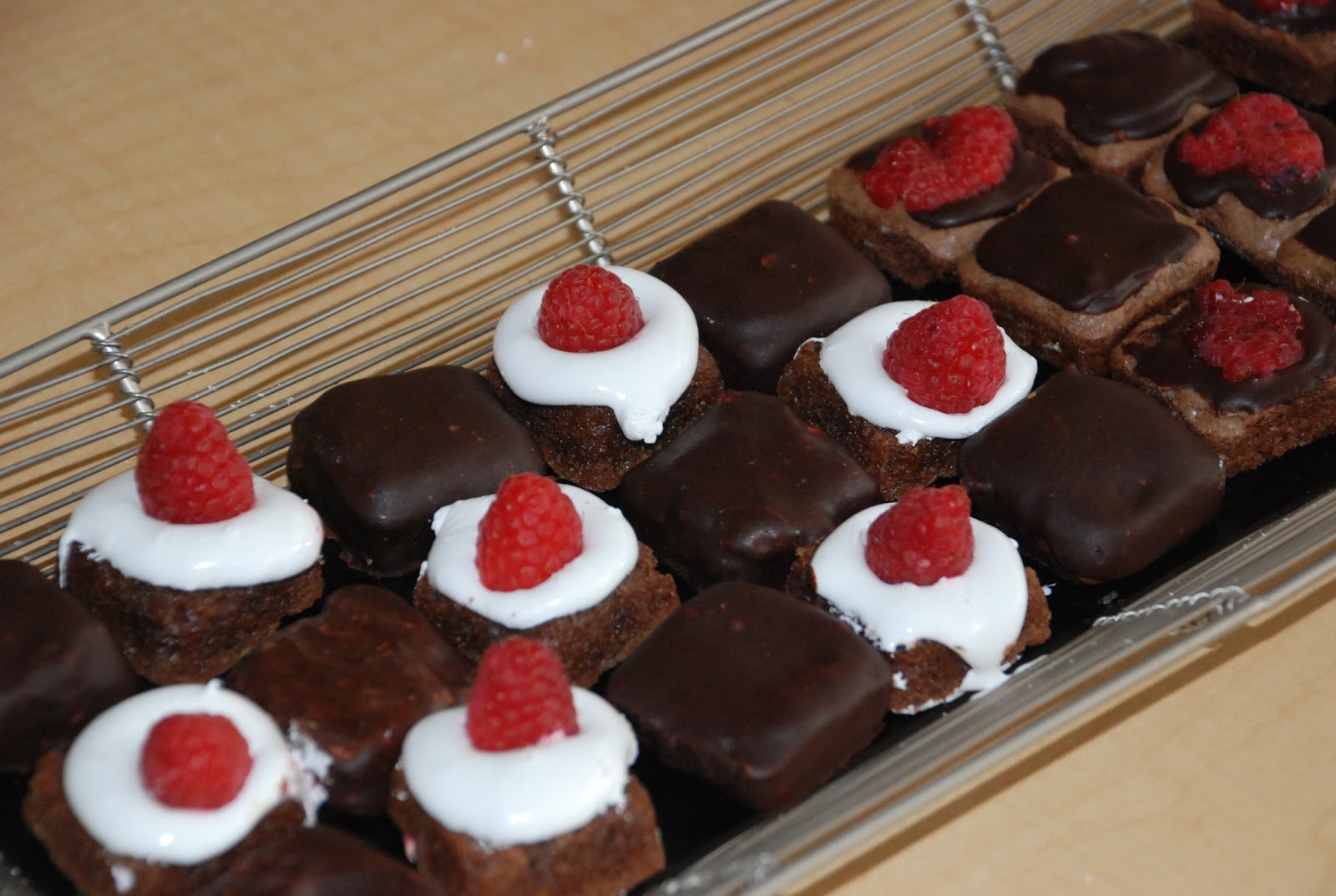 Some got chocolate ganache heaped on top of the brownie bites instead of a complete coating.