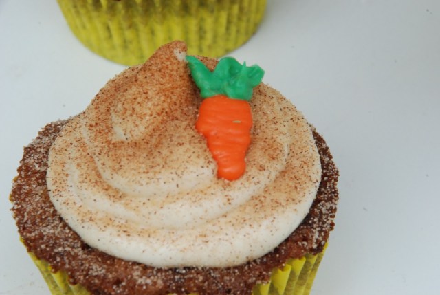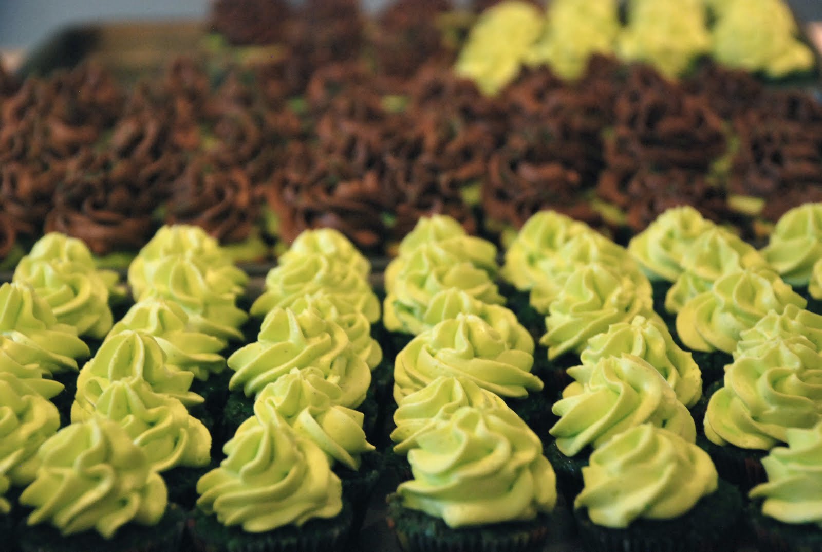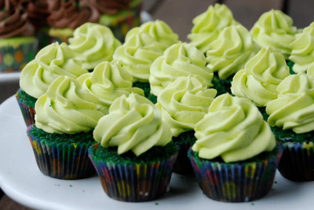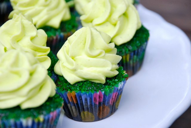I’ll give you a hint. Here we have some green velvet cupcakes dipped in sprinkles with cream cheese frosting.