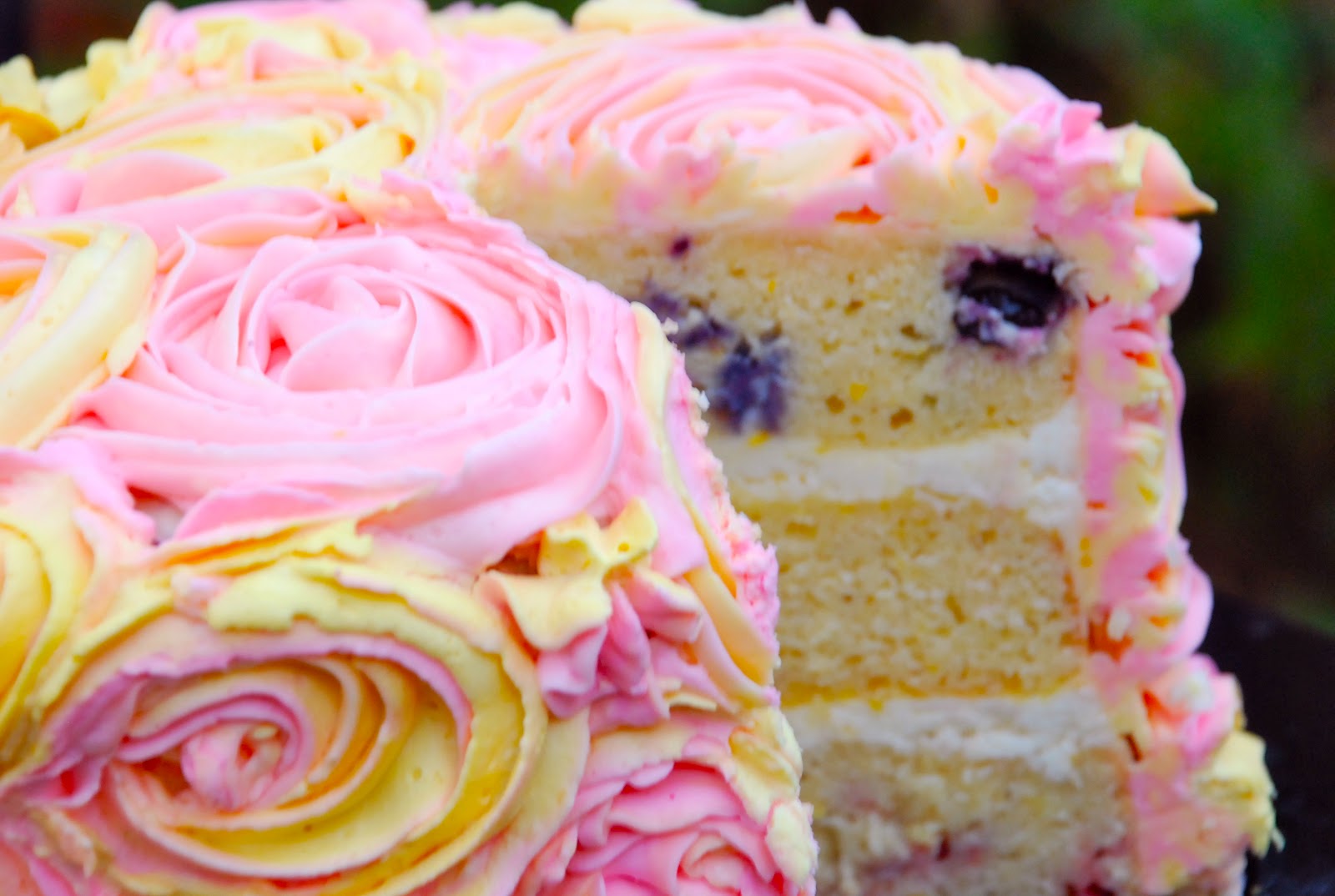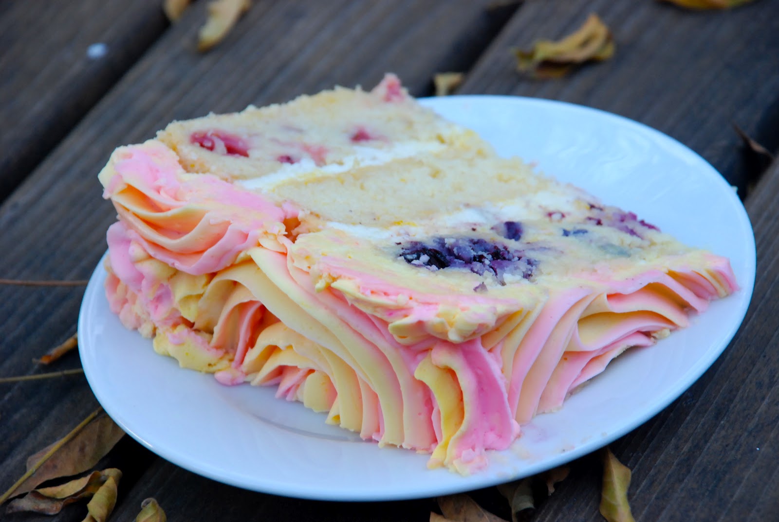 Top layer: lemon blueberry. Middle layer: lemon lemon. Bottom layer: lemon strawberry.