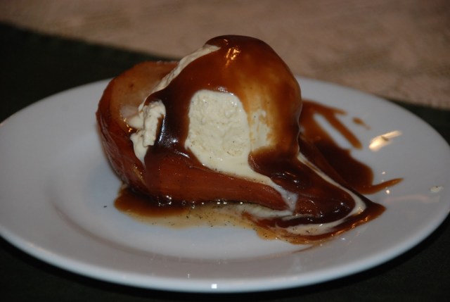 Cold homemade vanilla bean ice cream on top of a warm pear straight from the oven.