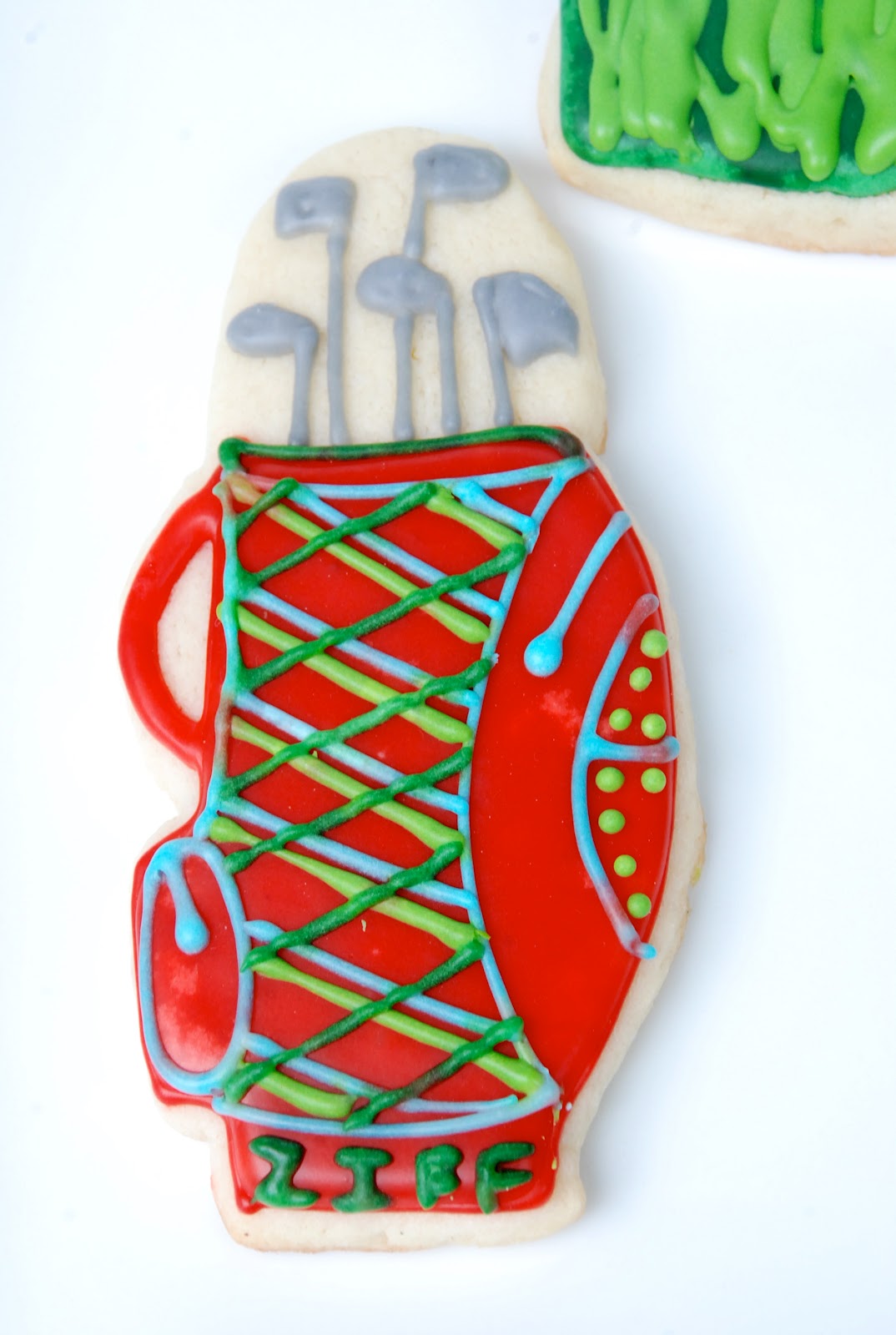 This little golf bag cookie has some personalization at the bottom and is stuffed with golf clubs of all shapes and sizes. The plaid pattern was a fun way to incorporate more colors into the cookie.