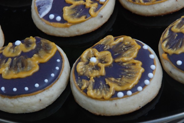 I tried to get a closeup of the royal icing marbling technique here. Basically, you pipe out lines of different colored icing next to each other and run a toothpick through them before they set. It’s a very fun and forgiving technique.