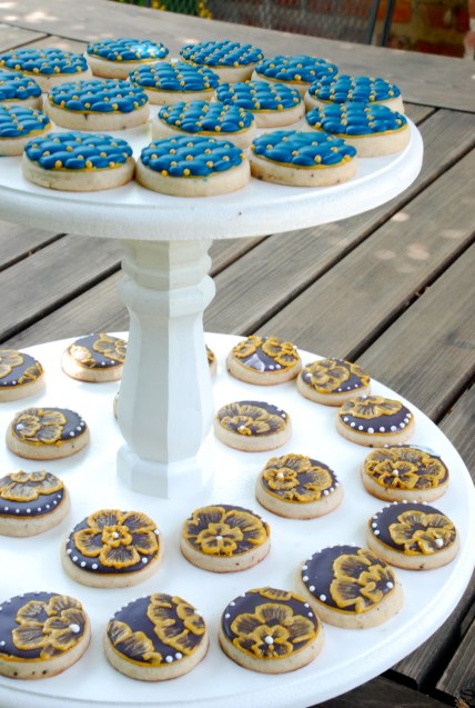 I used a new technique, brush embroidery, for these flower cookies. You use a small damp brush to pull the lines of frosting inward while the icing is still wet.